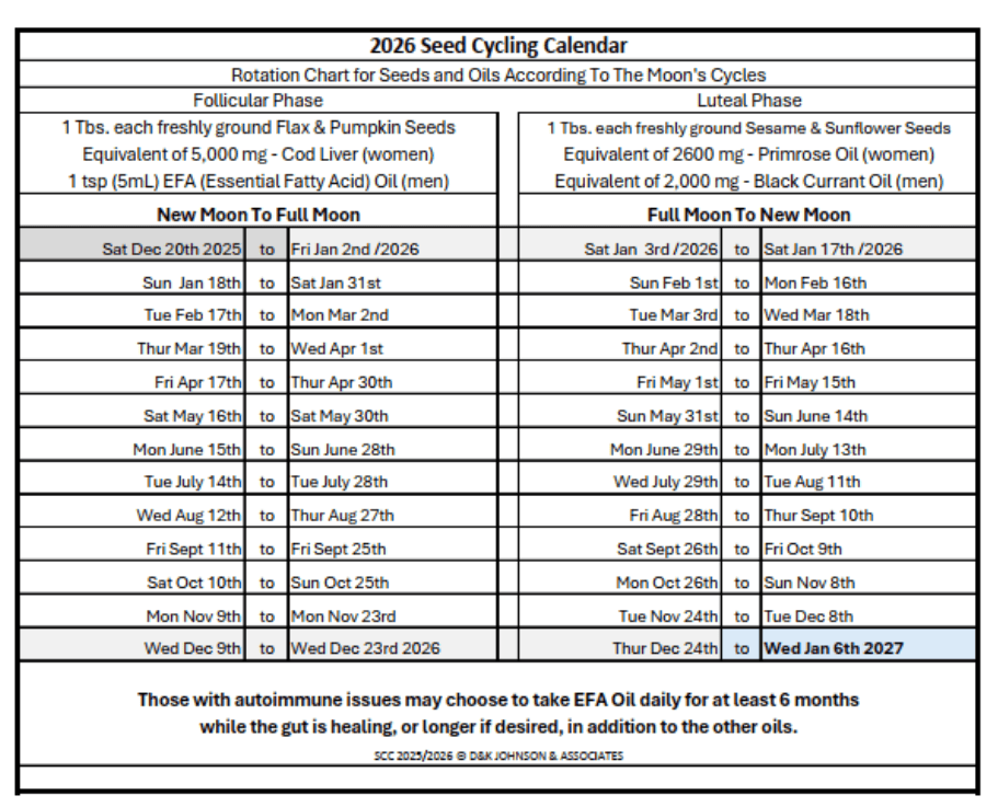We began a new phase today using Sesame and Sunflower Seeds with Evening Primrose Oil (women) or Black Currant Oil (men). Additionally, a new calendar chart is available and can be found in the article, replacing last year’s. You can also copy and print the chart above if you highlight/click on it, as well as the one shown in the main article. I have not been able to get the “download” feature in the main article to accept the correct link, so it is not possible to download the chart as yet. (I am working on that).
