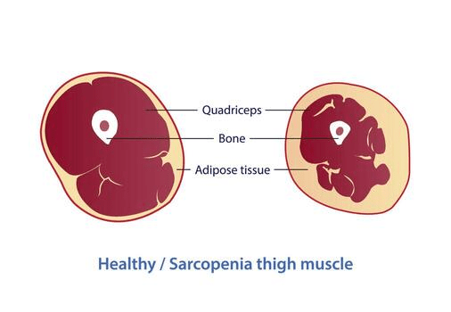 Sarcopenia is a condition where the mass of the muscles is lost or diminishing, leading to weakness and reduced ability to maintain balance and stamina. While osteoporosis may be seen as a silent condition, sarcopenia is not and is much more noticeable. As seen in the drawing below, muscle mass can become greatly diminished or atrophied. This can have a significant impact on bone health.